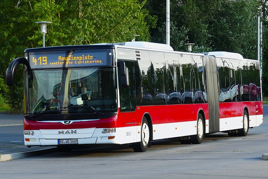 Aktuelles Thema: Diverse Busse Heute: 25.07.2025: BS-VG 1407 (BSVG Braunschweiger Verkehrs-GmbH) auf VRB-Linie 419 (Verkehrsverbund Region Braunschweig GmbH) in Warteposition zur Abfahrt zum Amalienplatz am Hauptbahnhof Braunschweig