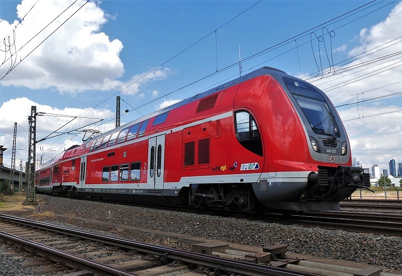 01.09.2022: DB 446 033 + DB 446 010 (Bombadier-Twindexx-Vario, vierteilig, Bj. 2017) in einer Zweiergarnitur als RB 68 nach Wiesloch und RB 67 nach Hockenheim nach der Abfahrt von Frankfurt (Main) HBF kurz vor der Niederräder Eisenbahnbrücke gegen 14:26 Uhr: