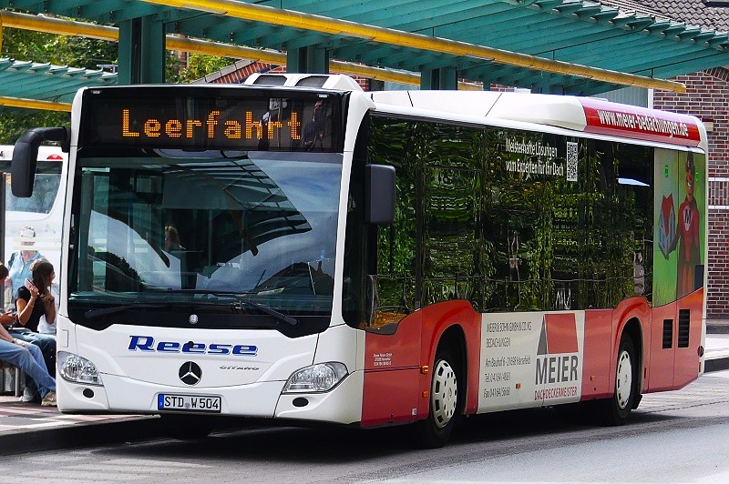 Reese STD-W 504 Publiziert 27. August 2025 | Von Waterclerk 27.08.2025: STD-W 504 ( Reese Reisen GmbH, Harsefeld) in Warteposition am Bahnhof Stade: