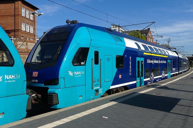DB 445 119 Publiziert 3. Oktober 2025 | Von Waterclerk 03.10.2025: DB 445 119 (Stadler KISS, BR 445, vierteilig, Bj. 2021) am Ende einer Dreiergarnitur als RE 8 nach Hamburg HBF zur Abfahrt vom Lübecker Hauptbahnhof um 12:09 Uhr: