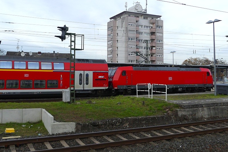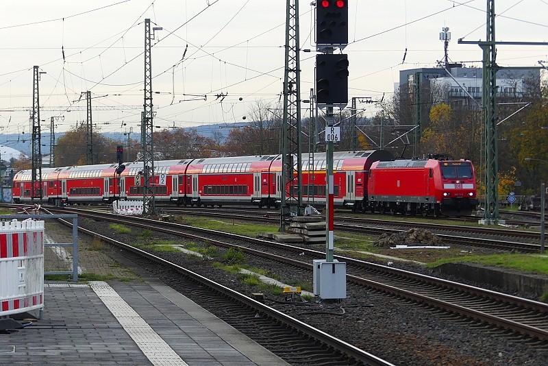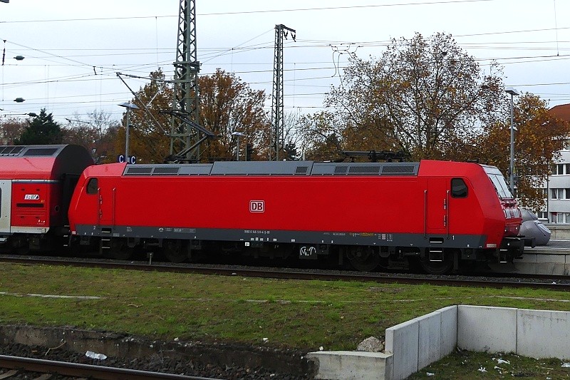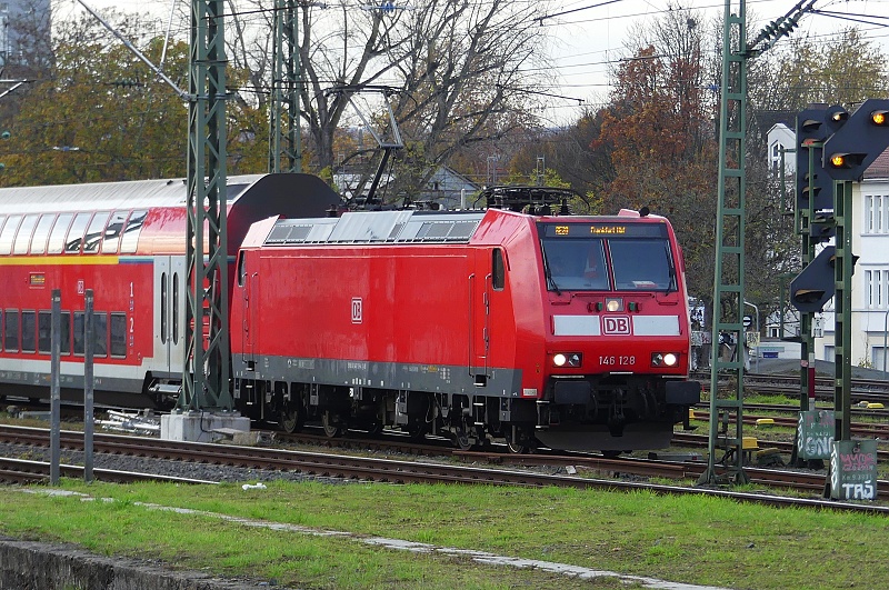 13.11.2025: DB 146 128-4 (Bombadier TRAXX P160 AC1, Bj. 2005) mit RE 20 von Limburg (Lahn) nach Frankfurt (Main) HBF bei der Einfahrt in den Bahnhof Höchst gegen 14:50 Uhr: