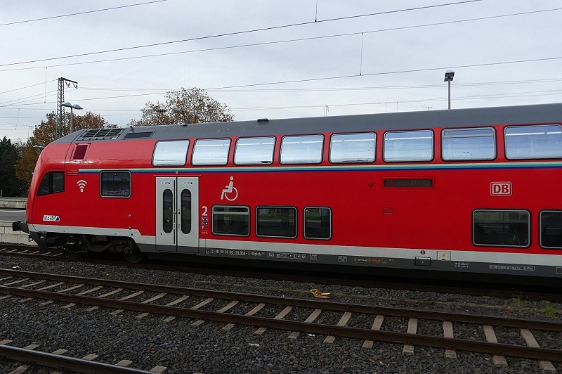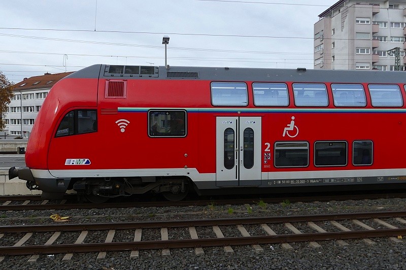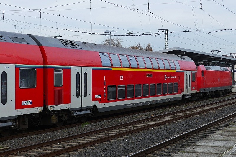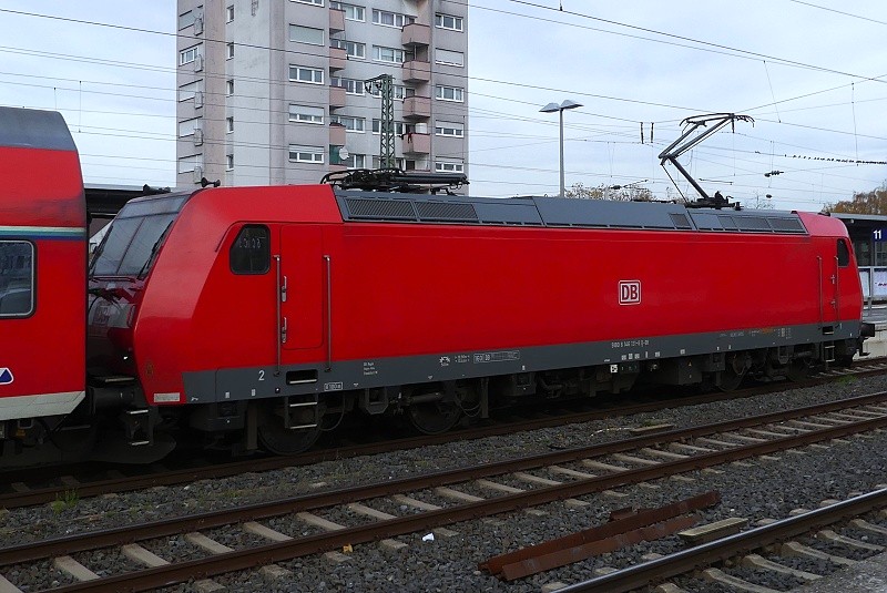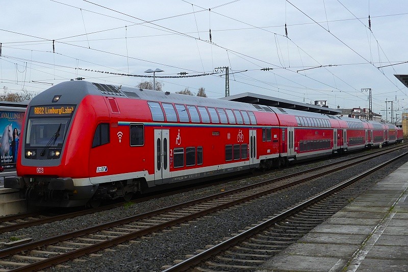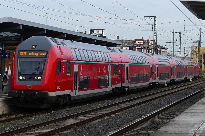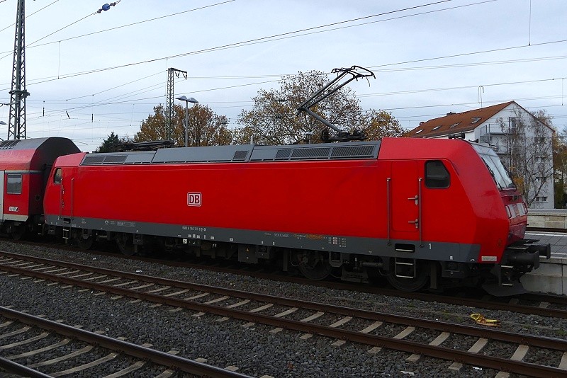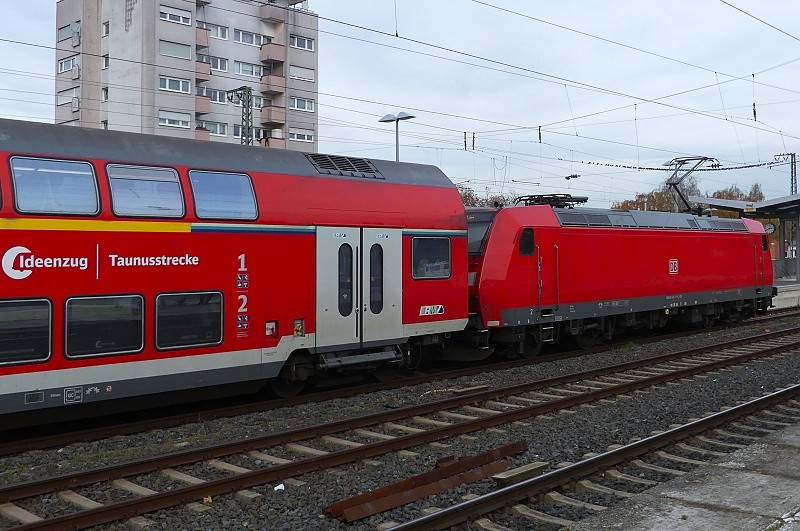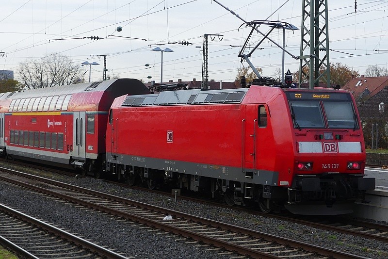 13.11.2025: DB 146 131 (Bombadier TRAXX P160 AC1, Bj. 2005) schiebt RB 22 von Frankfurt (Main) HBF nach Limburg (Lahn) nach einem Zwischenstopp aus dem Bahnhof Höchst gegen 14:40 Uhr…vorne Dosto-Steuerwagen 50 80 86-35 069-3: