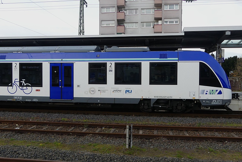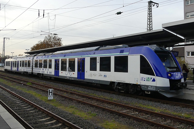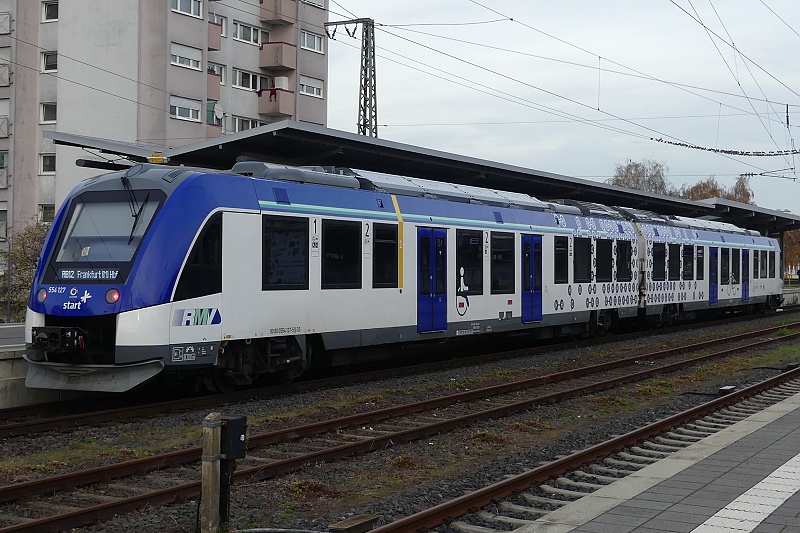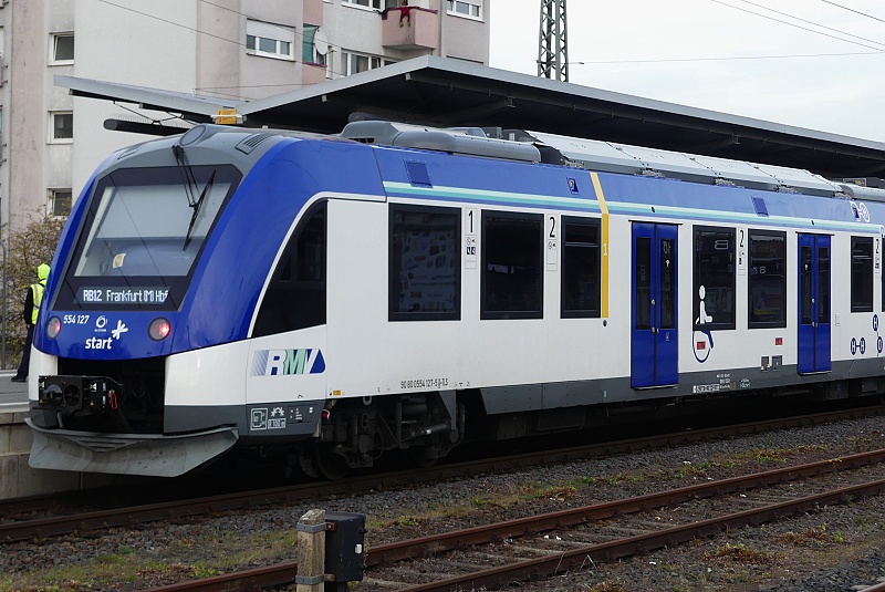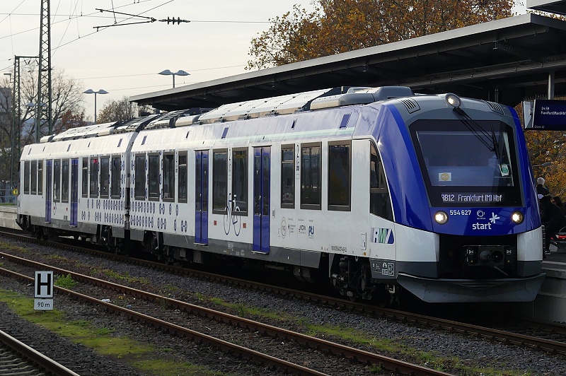 13.11.2025: start 554 127/627 (Alstom Coradia iLINT, Bj. 2023) der Fahrzeugmanagement Region Frankfurt RheinMain (fahma) für die Regionalverkehre Start Deutschland GmbH (Taunusnetz) als RB 12 aus Königstein (Ts) nach Frankfurt (Main) HBF bei der Ankunft im Bahnhof Höchst zur Weiterfahrt um 14:59 Uhr: