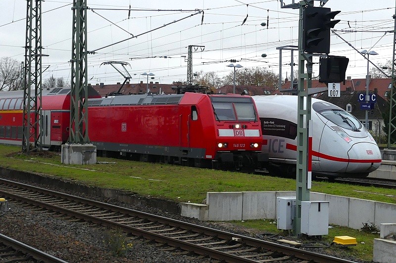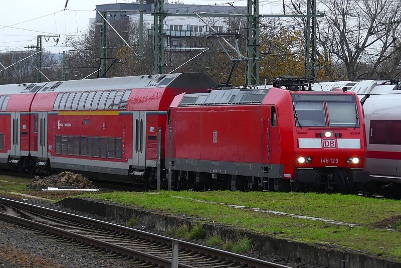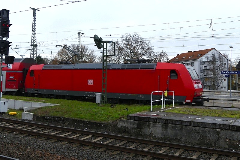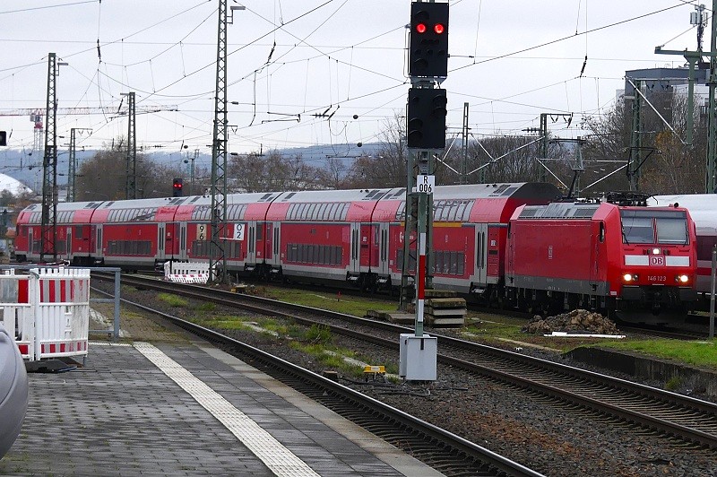 19.11.2025: DB 146 123-5 (Bombadier TRAXX P160 AC1, Bj. 2005) mit RB 22 von Limburg (Lahn) nach Frankfurt (Main) HBF bei der Einfahrt in den Bahnhof Höchst gegen 13:00 Uhr: