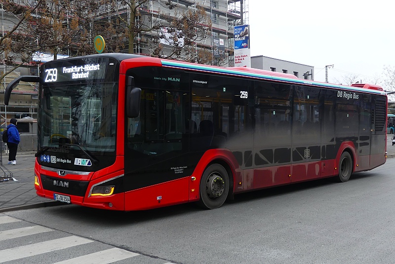 09.02.2026: MZ-DB 2584 (DB Regio Bus Mitte GmbH) auf VHT-Linie 259 (Verkehrsverband Hochtaunus) nach Ankunft aus Oberursel an der Endhaltestelle am Bahnhof Höchst: