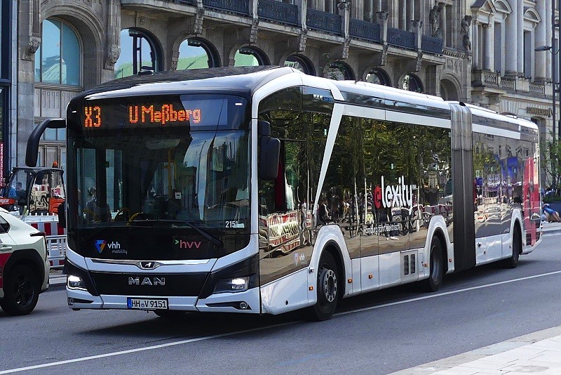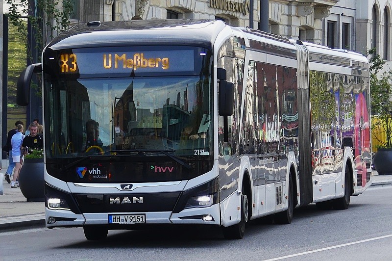 11.08.2025: VHH 2151 (HH-V 9151) der VHH mobility-Verkehrsbetriebe Hamburg-Holstein GmbH auf XpressBus-Linie X3 (HVV Hamburger Verkehrsverbund Gesellschaft mbH) in Richtung Messberg (U) an der Haltestelle Jungfernstieg: