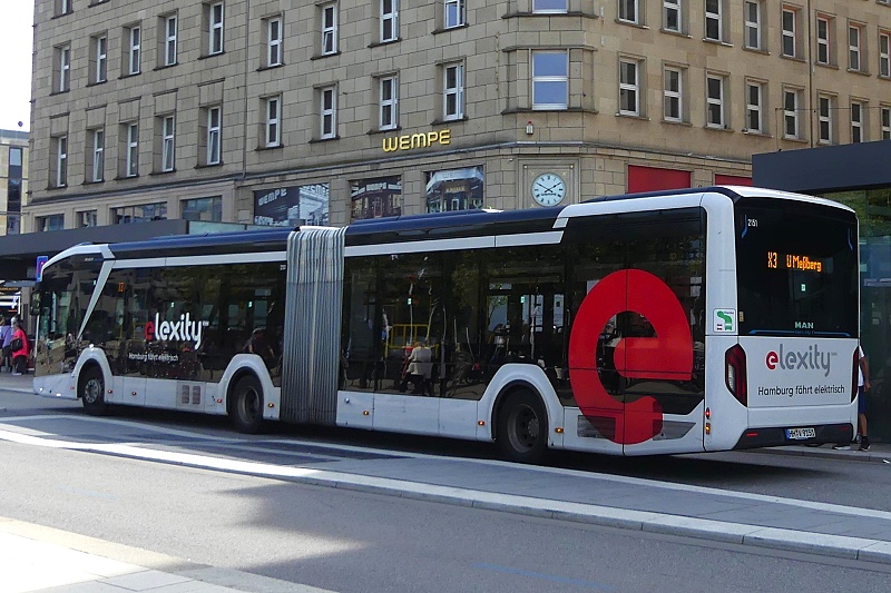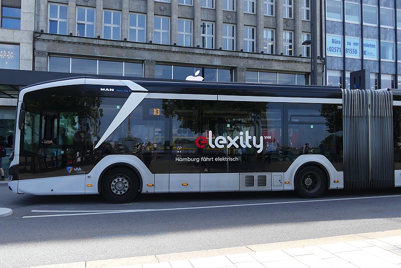 11.08.2025: HHA 4001 (HH-YB 4001) der Hamburger Hochbahn AG (HHA) auf MetroBus-Linie 5 (HVV Hamburger Verkehrsverbund Gesellschaft mbH) in Richtung Hauptbahnhof ZOB an der Haltestelle Jungfernstieg: