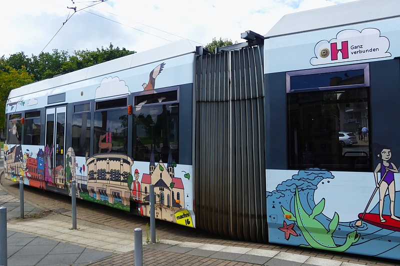 02.08.2025: HVG 5 HILDEGRIM (HeiterBlick/Kiepe-Elektrik, Typ NGTW6-H Leoliner, Baujahr 2007) der Halberstädter Verkehrs-GmbH auf VTO-Linie 2 (Verkehrs- und Tarifgemeinschaft Ostharz) aus Richtung Sargstedter Weg bei der Ankunft am Bahnhof Halberstadt: