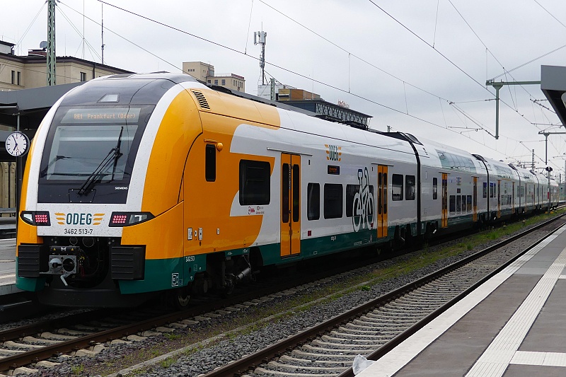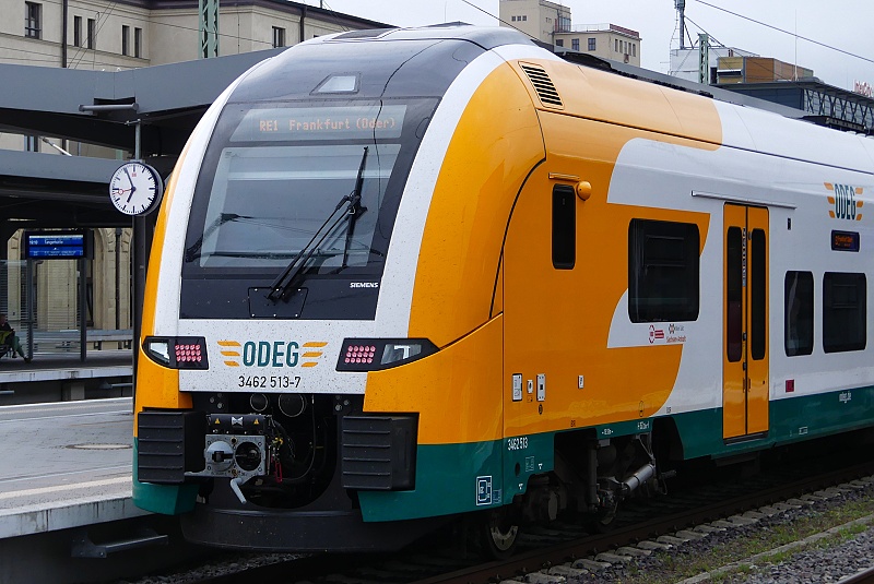 27.07.2025: ODEG 3462 513-7 (Siemens Desiro HC, BR 3462, sechsteilig, Bj. 2022) der Ostdeutschen Eisenbahn GmbH als RE 1 zur Abfahrt nach Frankfurt (Oder) vom Hauptbahnhof Magdeburg um 19:12 Uhr:
