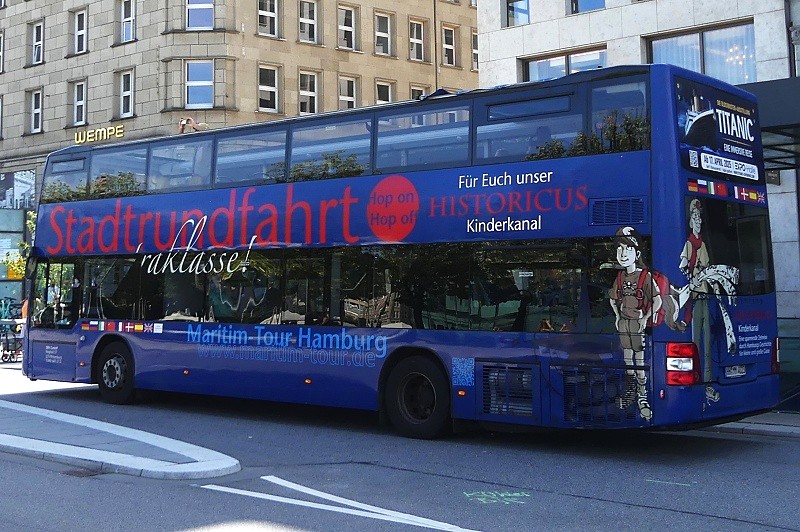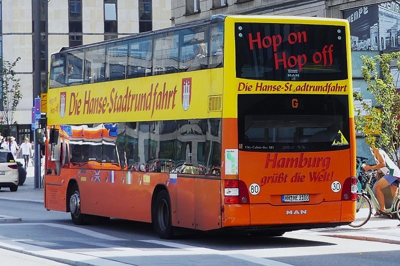 11.08.2025: HH-HE 3100 der Die Hanse-Stadtrundfahrt GmbH auf Sightseeing-Tour Hop on-Hop off in Höhe Jungfernstieg: