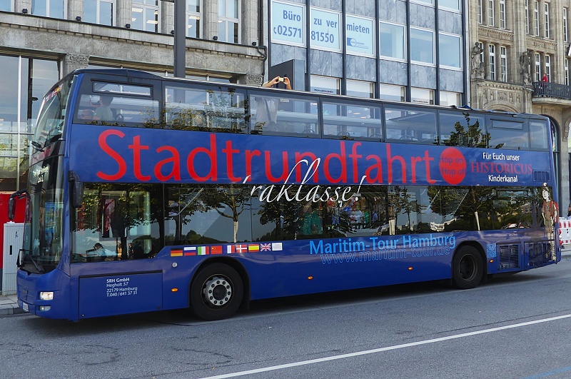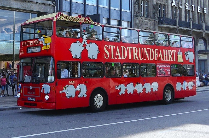 11.08.2025: HH-HE 3100 der Die Hanse-Stadtrundfahrt GmbH auf Sightseeing-Tour Hop on-Hop off in Höhe Jungfernstieg: