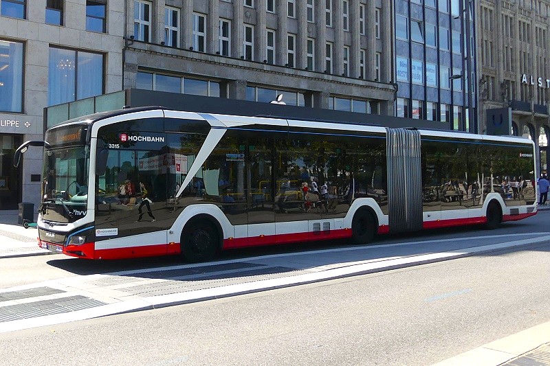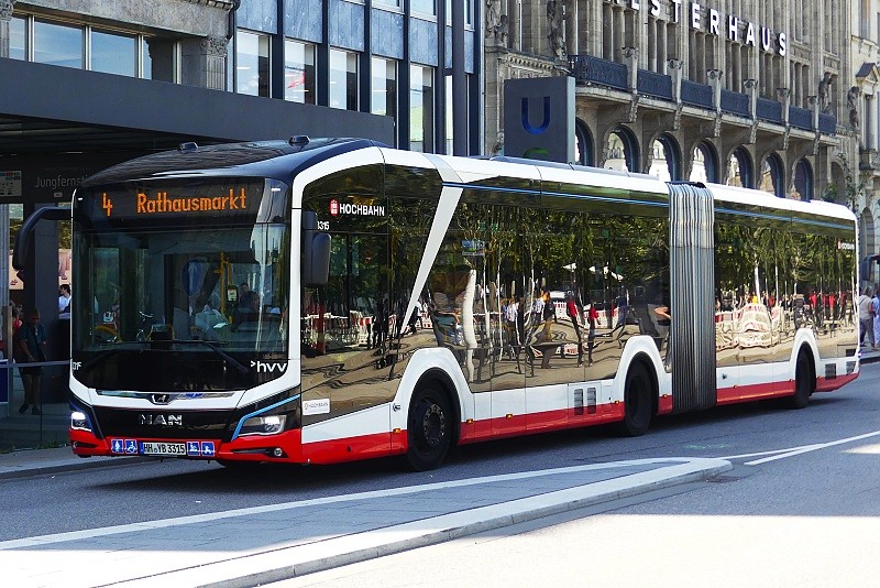 11.08.2025:HHA 3315 (HH-YB 3315) der Hamburger Hochbahn AG (HHA) auf MetroBus-Linie 4 (HVV Hamburger Verkehrsverbund Gesellschaft mbH) in Richtung Rathausmarkt an der Haltestelle Jungfernstieg: