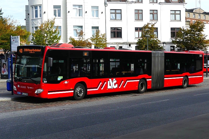20.09.2025: LVG HL-LV 1301 (301) (Lübeck-Travemünder Verkehrsgesellschaft mbH) auf Linie 40 nach Ankunft aus Scharbeutz in Warteposition an der Haltestelle Bahnhof/ZOB: